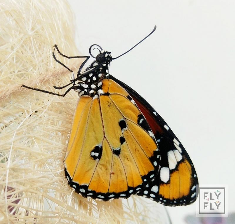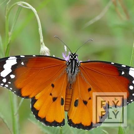 Яркая тропическая бабочка с размахом крыльев до 6 см. Основной цвет крыльев - оранжевый, с черной каймой. Срок жизни до двух недель.